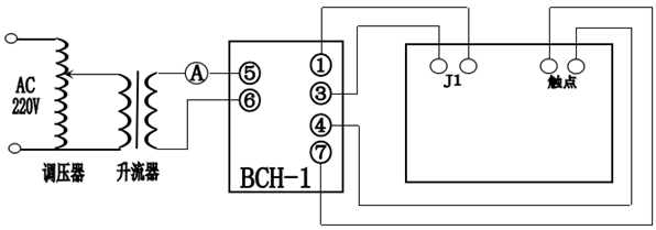 按上圖接線,斷開(4)(6)端子的連接片,動作回路取39匝,制動回路取14匝,調(diào)壓器(較大容量5KVA以上)和本儀器使用同-220V電源時,升至電流到要求的安匝,按交流繼電器的方法做出動作電流。如果動作安匝安全不對,可能是制動電流和動作電流的相角是180度,把制動電流反相就好了,如果本儀器使用三相電中的一相,調(diào)壓器使用另外一相,通過改變相別的將升流器正接反接可得到60°的相角。如外接移相器,亦可得到全部的0°、30°、60°、90°的相角。
