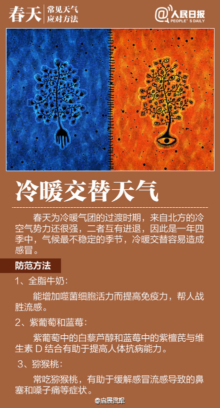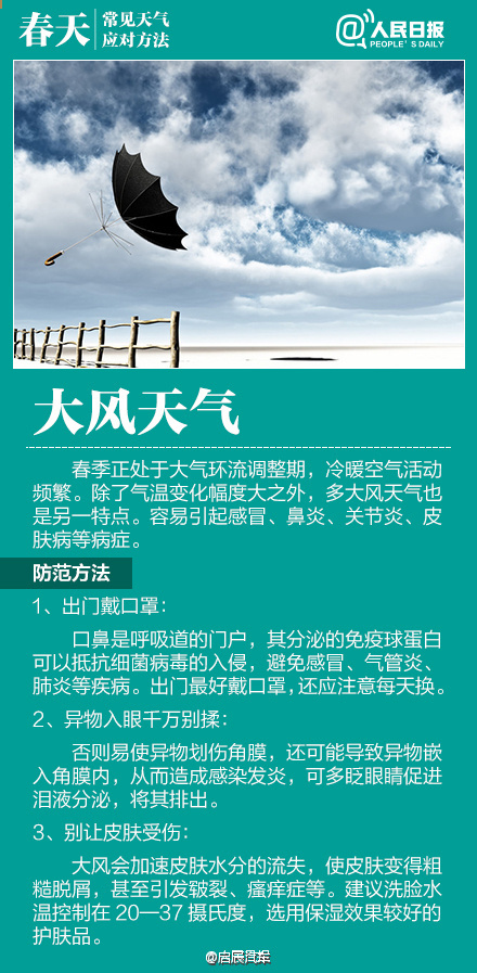 如何應對初春多變天氣作者:合眾電氣發布時間:2016-03-23瀏覽量:11257 次字體顯示:【大】【中】【小】 春季天氣調皮,昨天還日光融融閑賞花,今日就寒風瑟瑟緊添衣!大風、沙塵、陰雨等交替上演,讓感冒、過敏、關節炎等進入高發期。今天#世界氣象日#,四張圖教你應對春季多變天氣! 上一篇: HZXC-104D變壓器智能控制箱最新發貨現場下一篇: 面對問題疫苗,我們怎么辦?