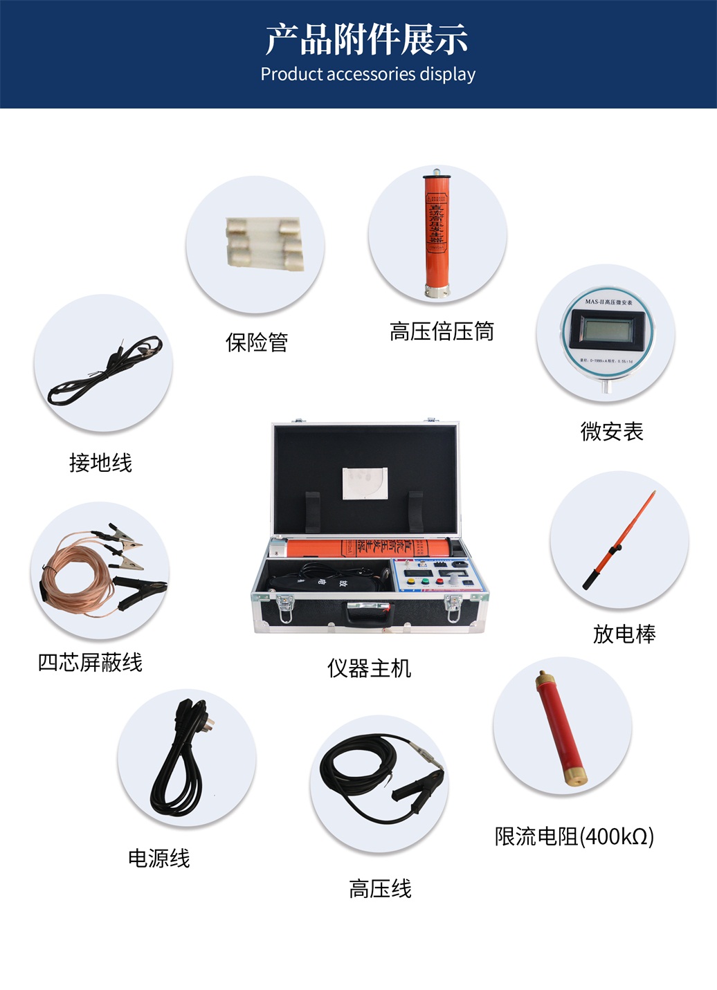 (1)精度高、測量準確。控制箱上電壓表直接顯示加在負載試品上的電壓值,使用時無需外加分壓器,接線簡單。儀器具有高、低壓端測量泄漏電流,高壓端采用圓形屏蔽數字表顯示,不怕放電沖擊,抗干擾性能好,適合現場使用。
