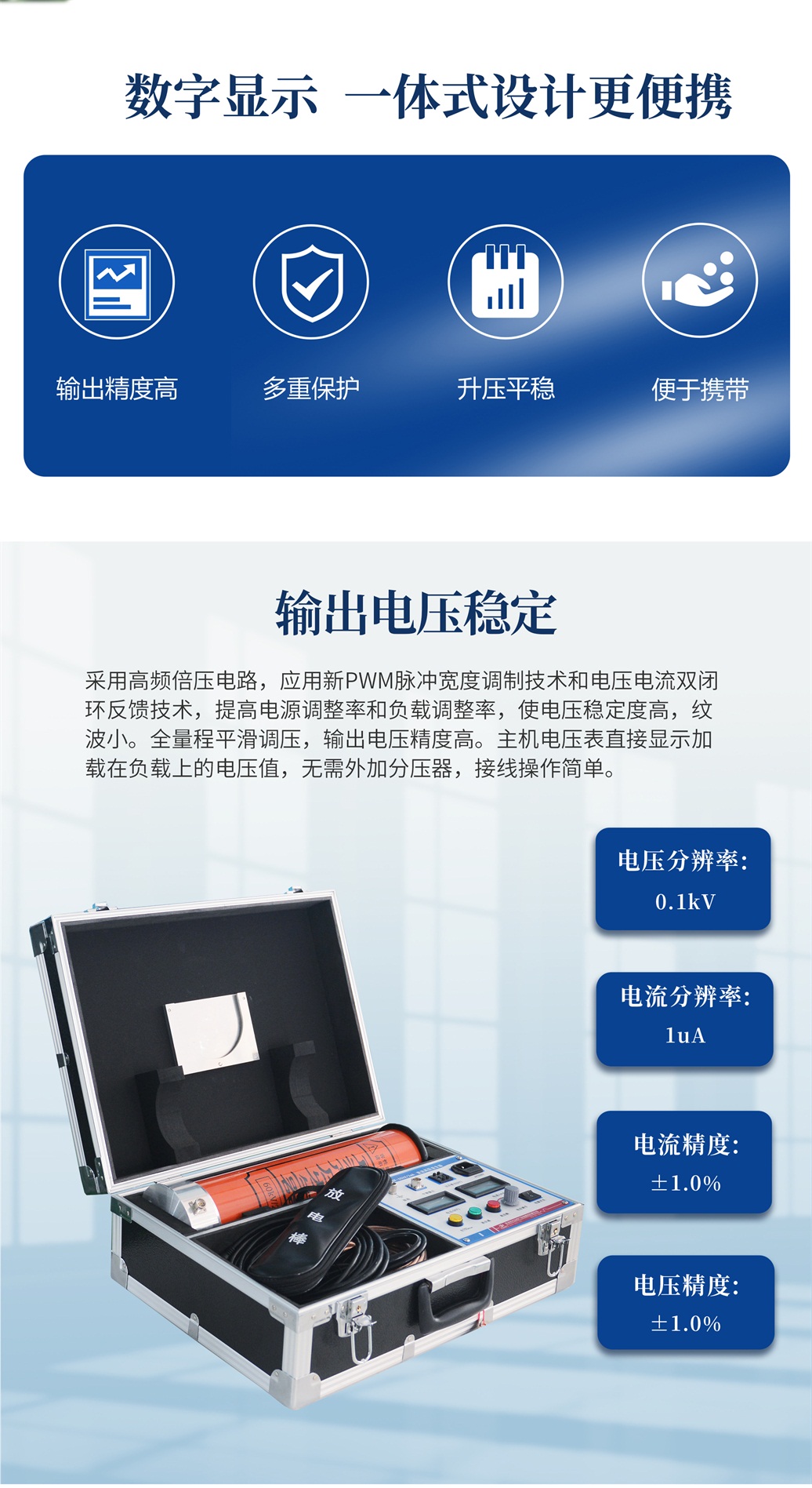 1、輸出電壓穩(wěn)定:采用高頻倍壓電路,應(yīng)用新PWM脈沖寬度調(diào)制技術(shù)和電壓電流雙閉環(huán)反饋技術(shù),提高電源調(diào)整率和負載調(diào)整率,使電壓穩(wěn)定度高,紋波小。全量程平滑調(diào)壓,輸出電壓精度高。主機電壓表直接顯示加載在負載上的電壓值,無需外加分壓器,接線操作簡單。電壓分辨率0.1kV,電流分辨率1uA。