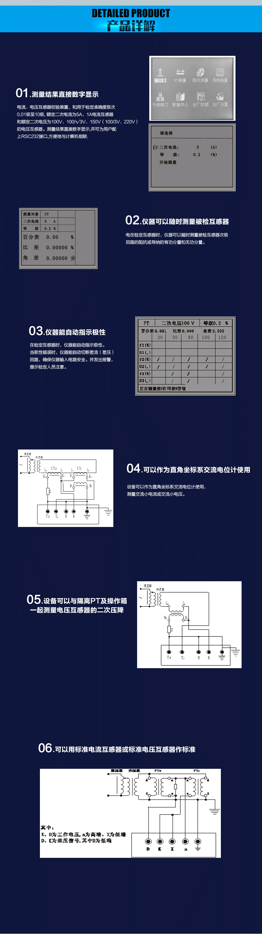1、電流、電壓互感器校驗裝置,和用于檢定準確度級次0.01級至10級,額定二次電流為5A、1A電流互感器和額定二次電壓為100V、100/√3V、150V(100/3V、220V)的電壓互感器。測量結果直接數字顯示,并可為用戶配上RSC232接口,方便地與計算機相聯.