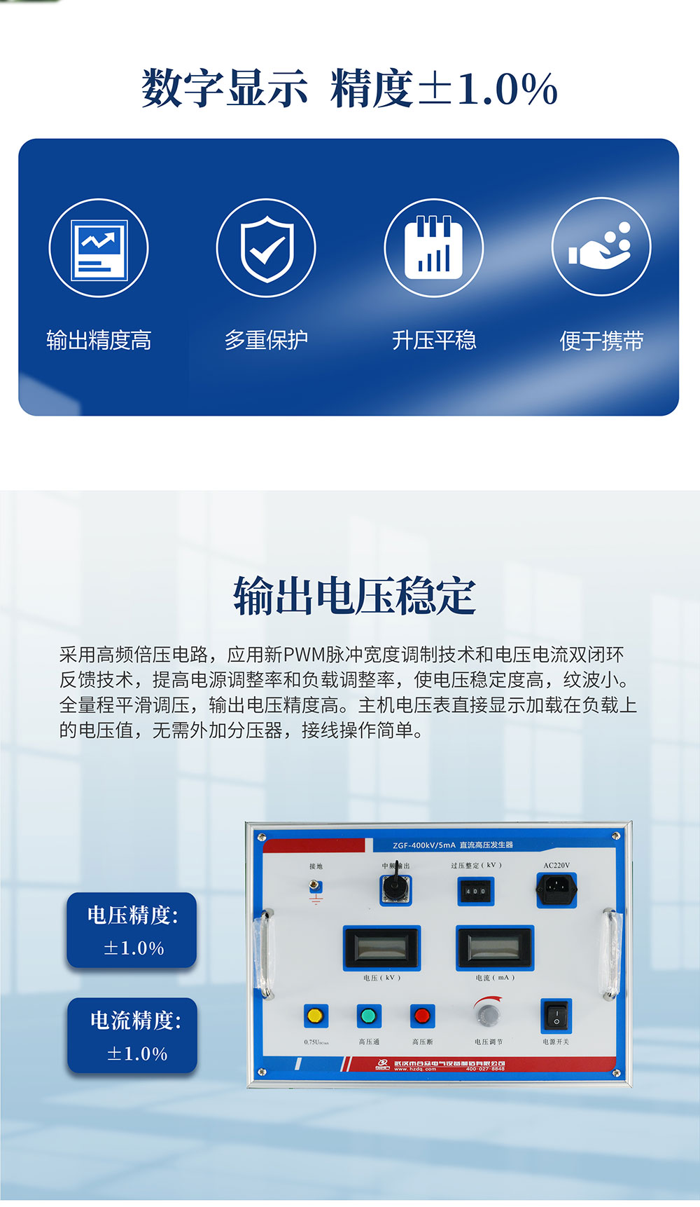 采用了高頻倍壓電路,應用了新的PWM高頻脈寬調制技術,閉環調整,采用了電壓大反饋,使電壓穩定度大幅度提高。使用性能卓越的大功率IGBT器件及驅動技術,并根據電磁兼容性理論,采用特殊屏蔽、隔離和接地等措施。使直流高壓發生器實現了高品質、便攜式,并能承受額定電壓放電而不損壞。具有輸出功率大、體積小的特點,有可靠的過壓、過流及零位合閘保護功能,帶0.75倍電壓切換功能。