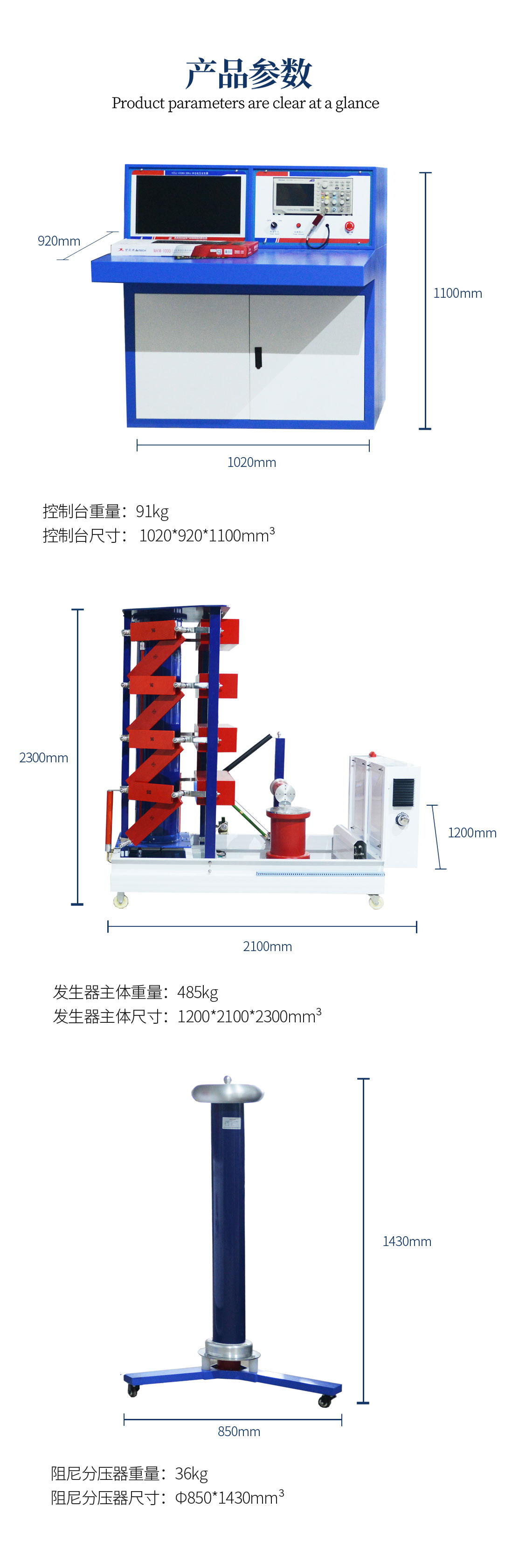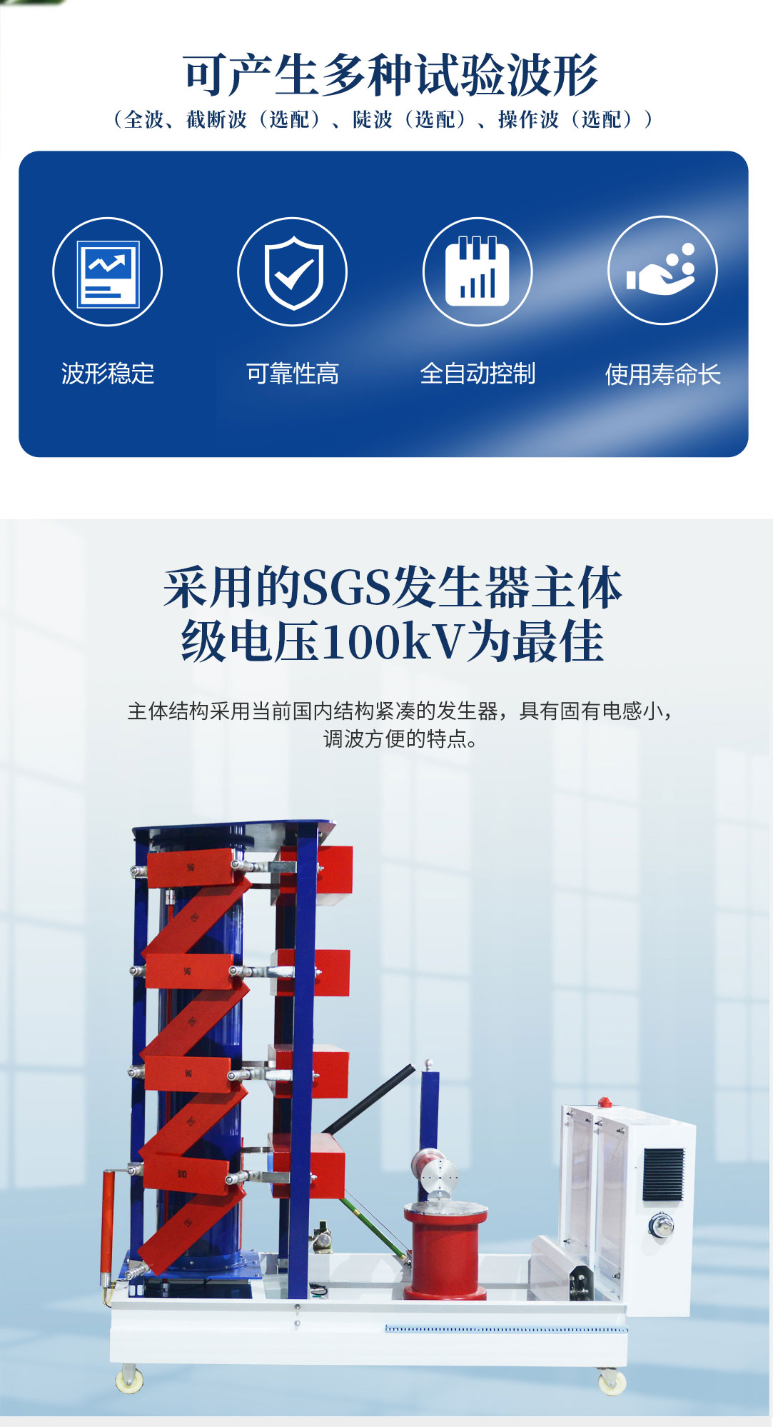 波頭時間:1.2±30%μs,波尾時間:50±20%μs,過沖:小于5%,效率:不低于90%?!?.2/50μs標準雷電沖擊電壓全波,效率大于90%。
