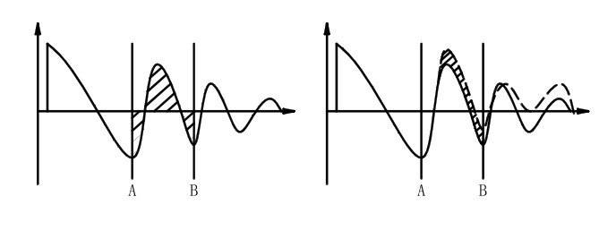 在任意指定的區(qū)間內(nèi),對標準線圈和被測線圈波形偏差部分的面積(如圖1-4-2中陰影部分)與標準線圈波形面積進行相除比較。計算出A-B區(qū)間內(nèi)差的面積,對比A-B區(qū)間內(nèi)標準波形面積,來判定偏差的程度。判定的標準用百分比(%)進行設定,計算結(jié)果在范圍內(nèi)的為合格品。波形偏差面積的大小表示電感值以及能量損耗程度的總和。此方法可較全面地檢查線圈的電感值及能量損失。